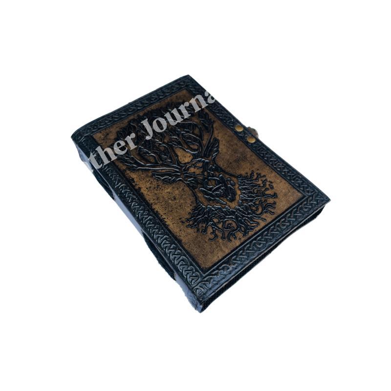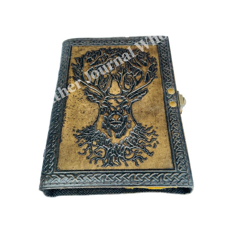 Antique Embossed Leather Journal DEER Metal Closure Charcoal Book of Spells Prop Handmade Paper Gift Him Day Personal organizer