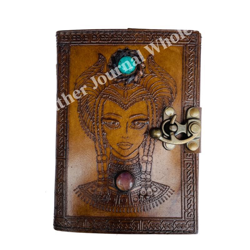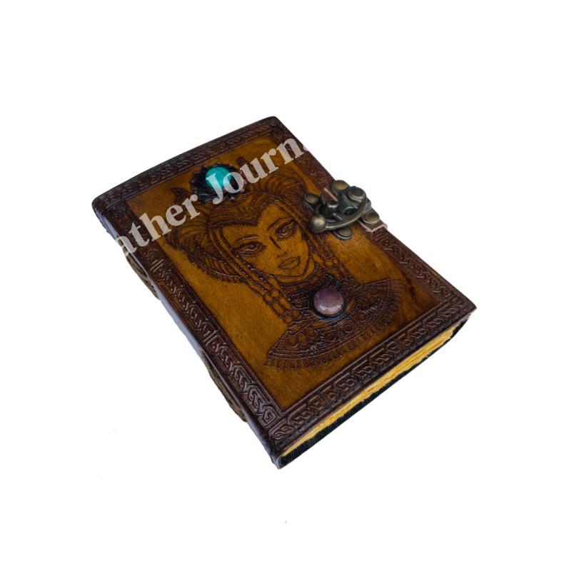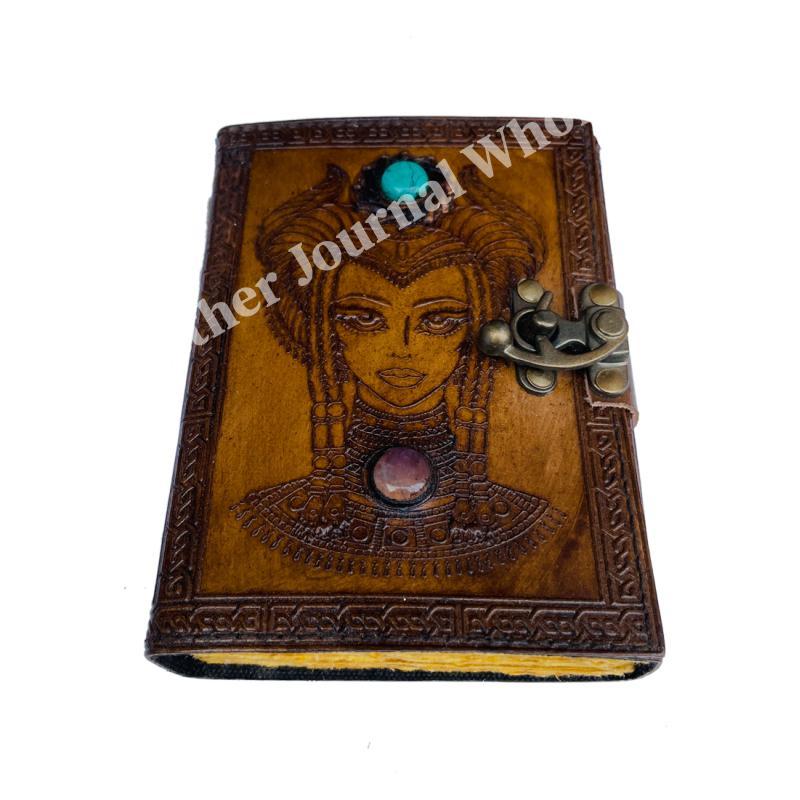 Antique Embossed Women face Stone Leather Journal Metal Closure Charcoal Book Spells Prop Handmade Paper Gift Personal organizer