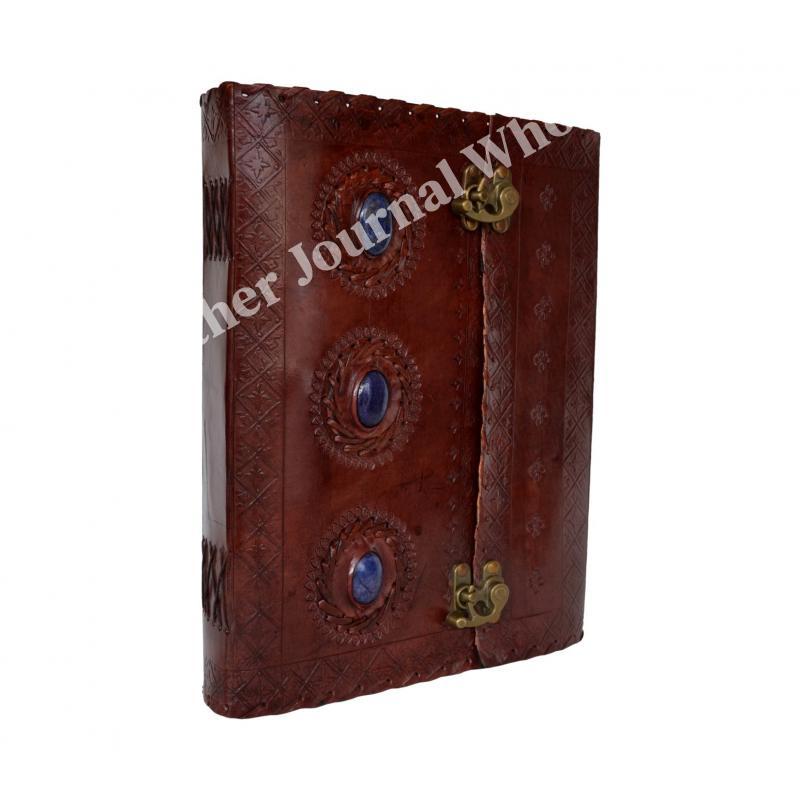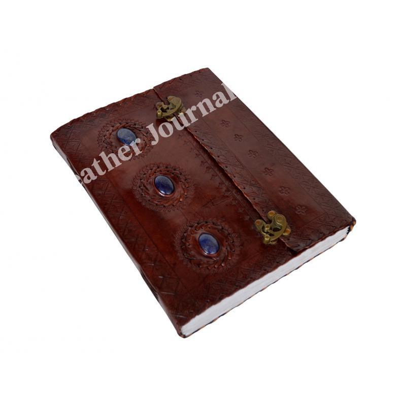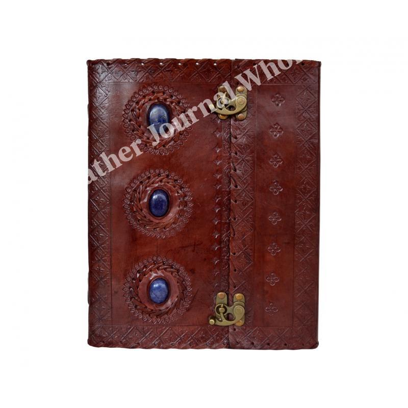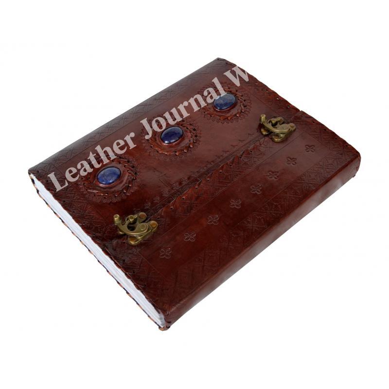 Embossed Large Triple Blue Stone Leather Bound Journal w/Double Swing Clasps