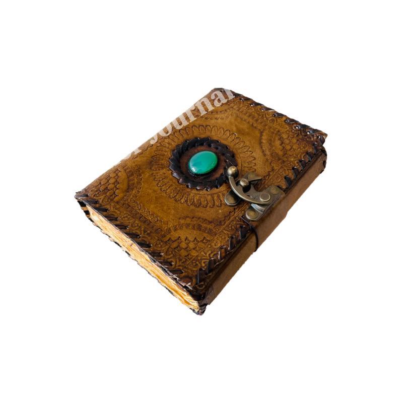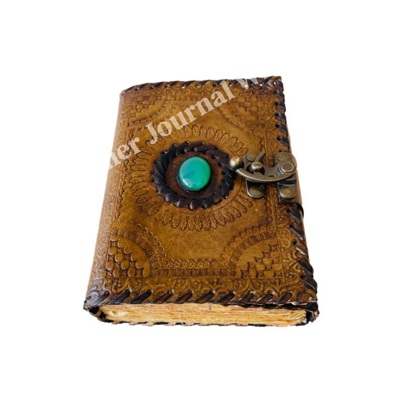 Handmade Leather Journal with Green Gemstone & Brass Lock | Vintage Brown Writing Notebook, Stone Embossed Diary, Travel Sketchbook, Unique Gift for Men & Women