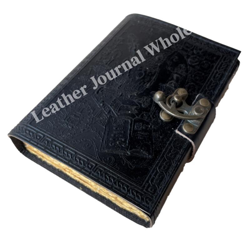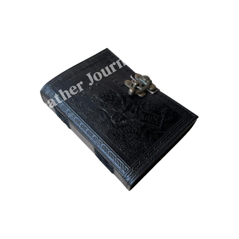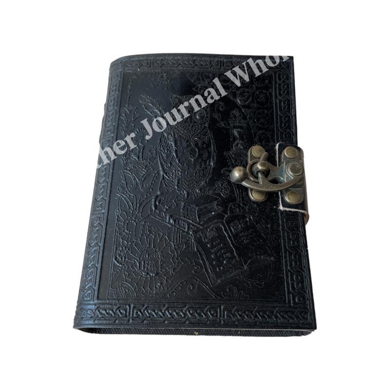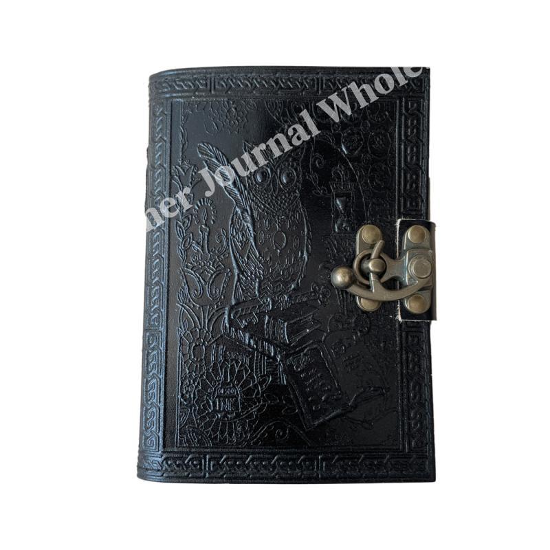 Leather Journal Antique Embossed with Lock Black Guest book Owl Handmade Paper Gift Him Day Personal organizer Notebooks Diary