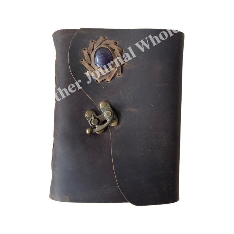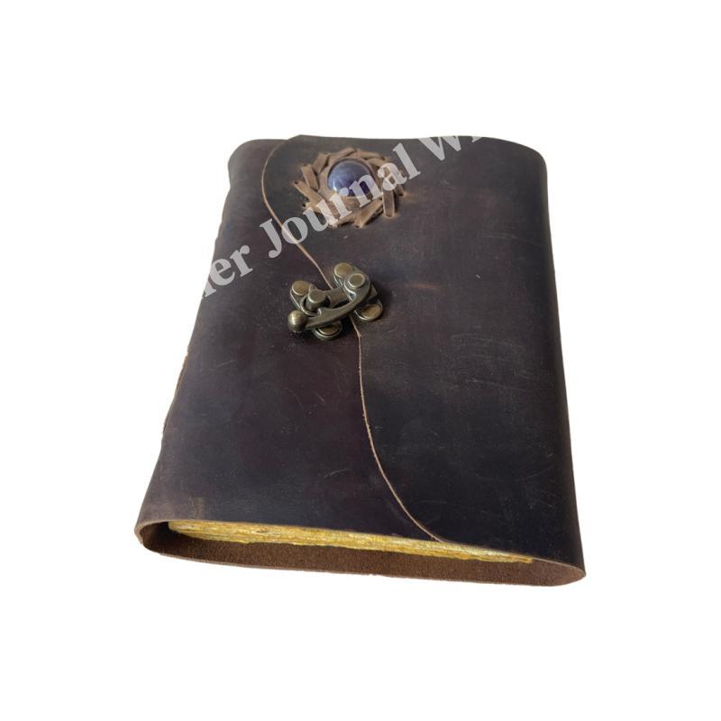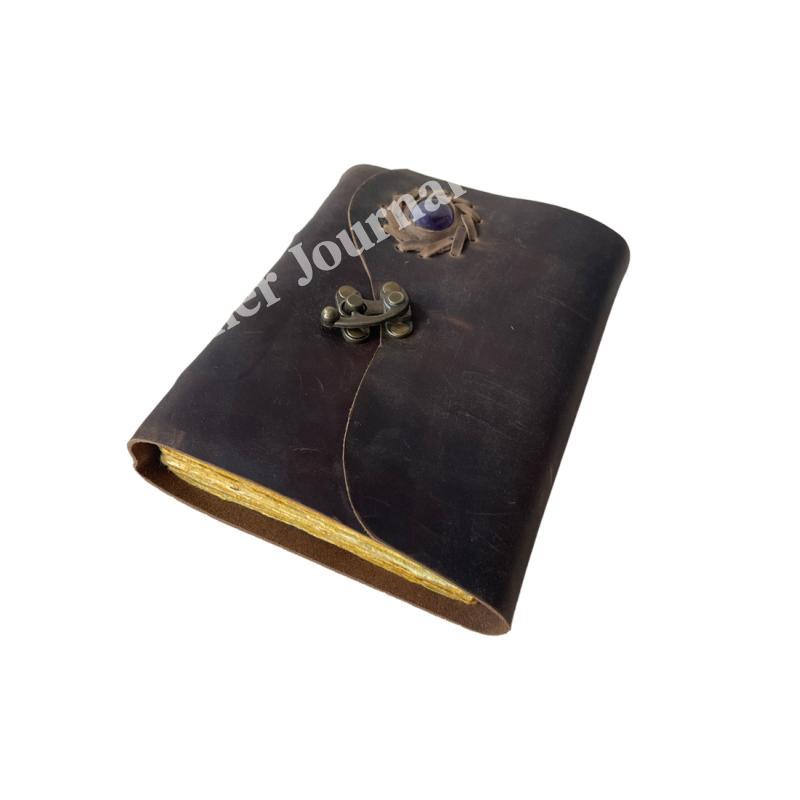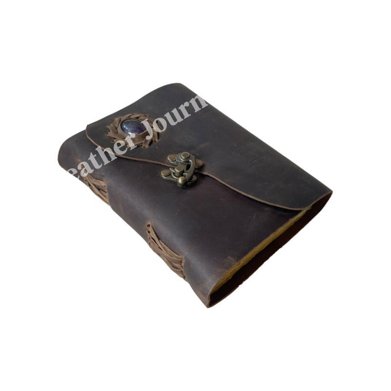 Soft Handmade Brown Vintage Leather Journal With Stone Book Of Shadows spells Design Journal For Unisex Unlined Deckle Paper