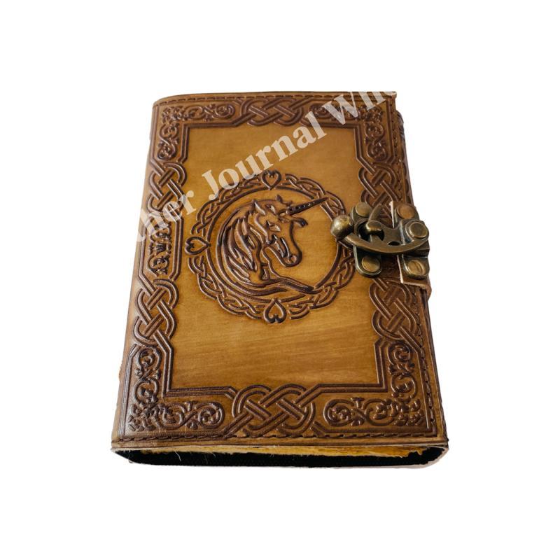Unicorn vintage leather book of spells Celtic wiccan journals for writing prop Charcoal handmade embossed deckle Art paper