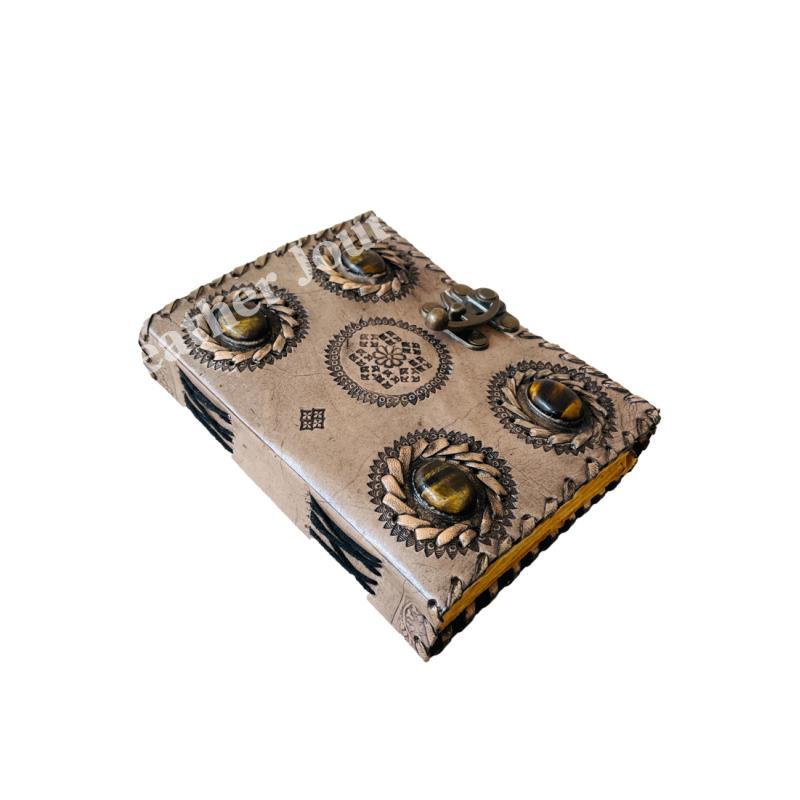 Vintage Handmade Leather Bound Journal with Gemstone Inlay and Brass Lock | Rustic Brown Diary Notebook for Writing, Sketching, Travel Notes & Unique Gift